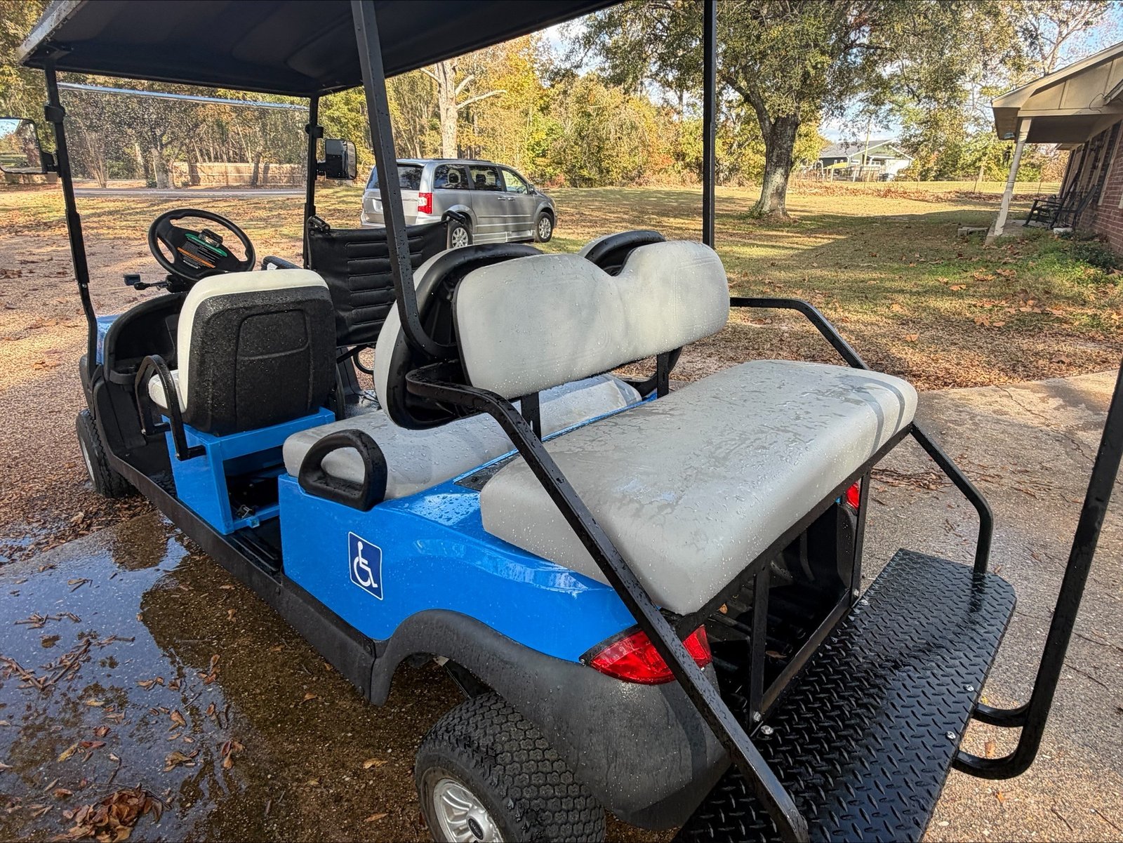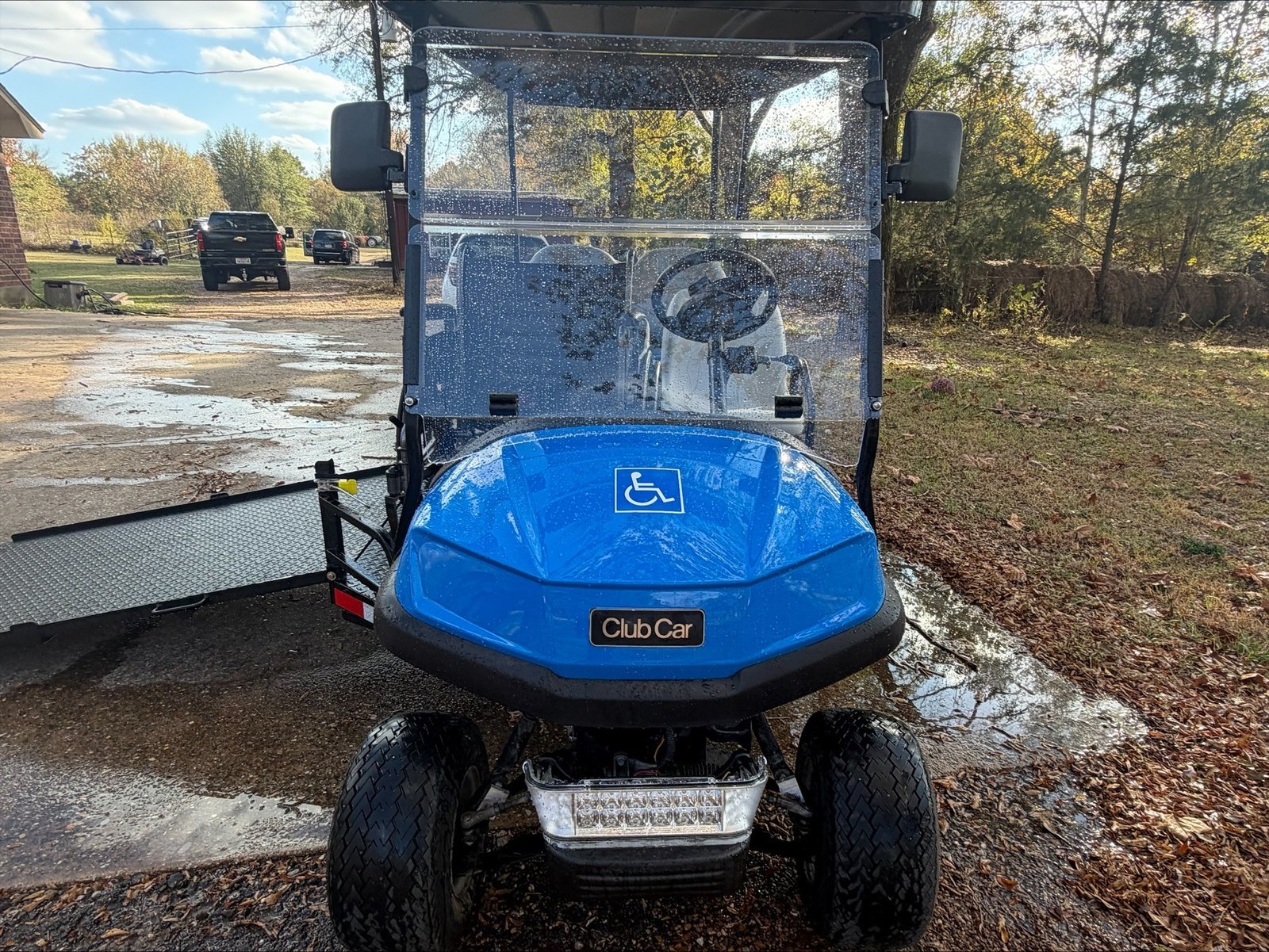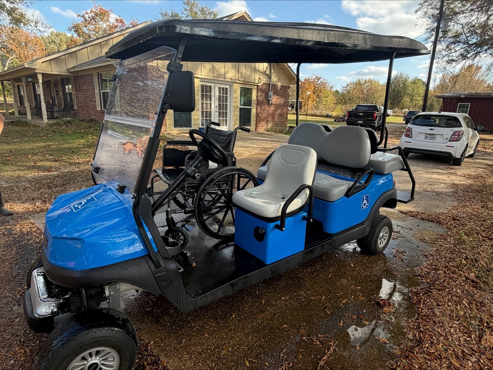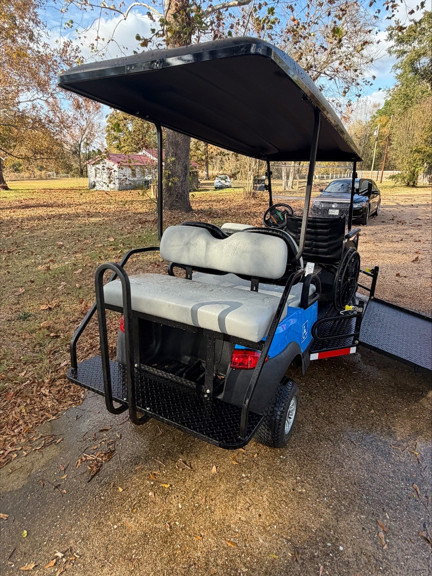The club car has been modified to support your ADA and disability needs and has the range to last where electric solutions may fail or not hold up especially for commercial applications.  This cart comes with headlights and turn signals.  It has a manual ADA wheelchair ramp with four positions for the securing of a wheelchair using floor locking industry standard tie downs.   The seat folds off the side for maximum wheelchair and powerchair positioning room and can carry a wheelchair, four passengers, and the driver!